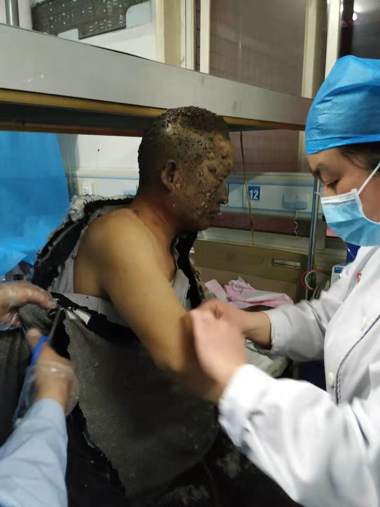 “當(dāng)時(shí),我兒子看到他爸頭上在著火,跺著腳撕心裂肺地哭喊,誰(shuí)能救救他爸。別人都在說(shuō)打110,我想著路邊有現(xiàn)成的車(chē),就叫個(gè)車(chē)到鄧州市醫(yī)院,因?yàn)闊弥?,就直接又轉(zhuǎn)南石醫(yī)院了。”崔振儉妻子說(shuō),崔振儉還不是燒得最重的,同村的崔生航燒傷更重。