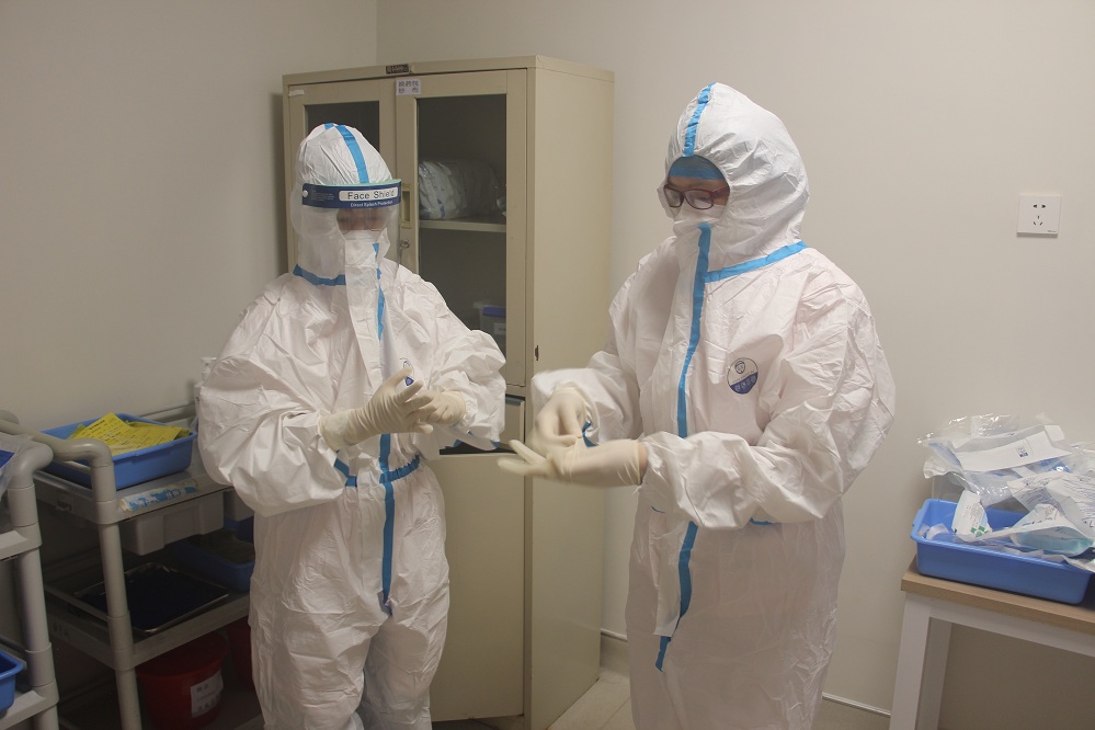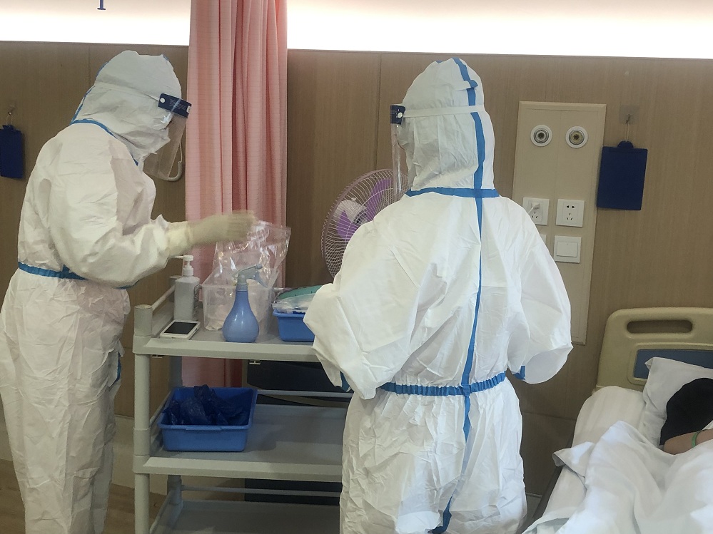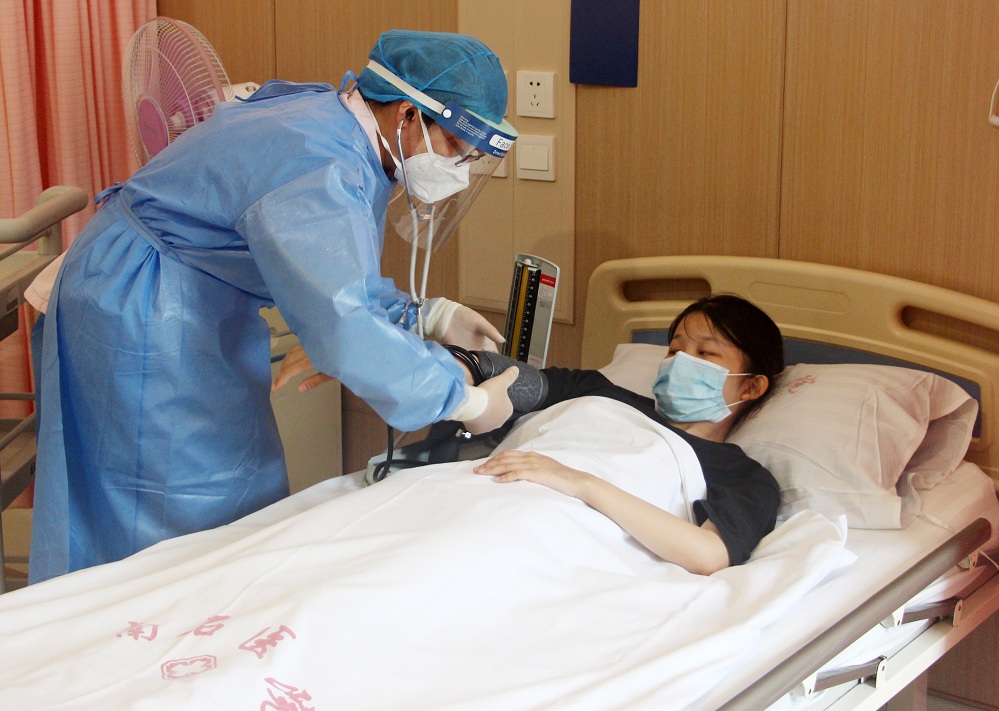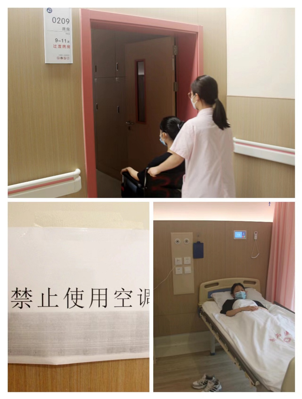 為避免延誤治療暫收入婦產(chǎn)科過渡病室,邊救治邊等待核酸檢測結(jié)果。過渡病房內(nèi)禁止使用中央空調(diào)。責(zé)任醫(yī)師、責(zé)任護士在清潔區(qū)穿戴醫(yī)用防護口罩、工作帽、手套、隔離衣、護目鏡/防護面屏、鞋套,進入過渡病室對患者實施診療護理操作。
