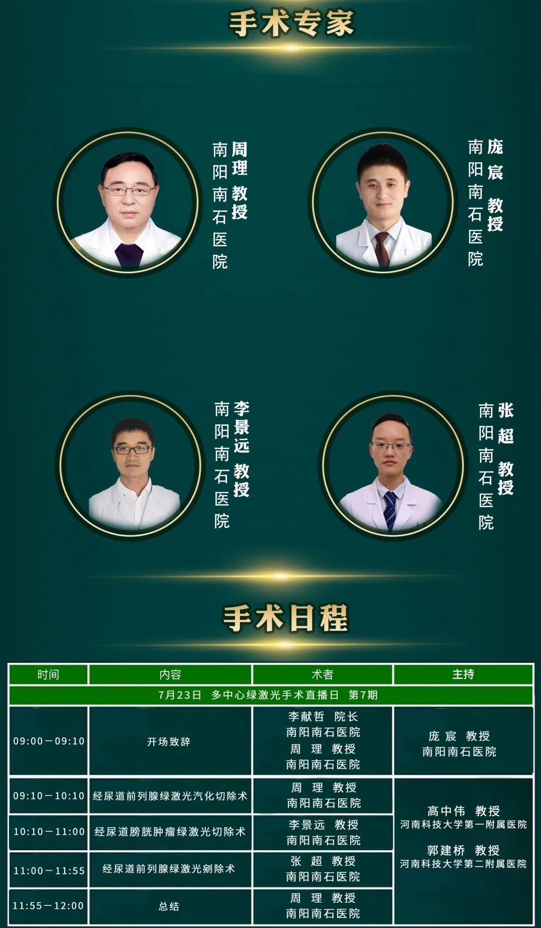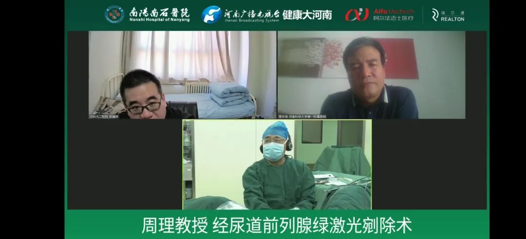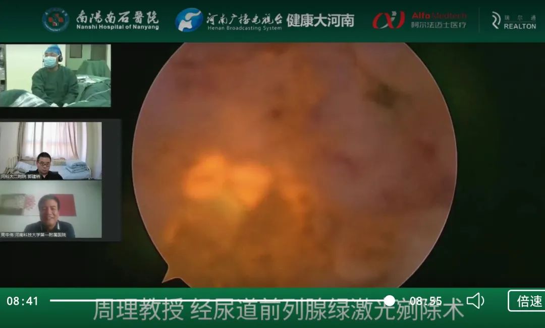 南石醫(yī)院執(zhí)行院長(zhǎng)李獻(xiàn)哲,泌尿外科主任周理分別在手術(shù)直播前致辭,南石醫(yī)院泌尿外科龐宸主持健康手術(shù)直播前主持。河南科技大學(xué)附屬一附院高中偉教授,河南科技大學(xué)附屬二附院郭建橋教授主持并點(diǎn)評(píng)綠激光健康直播。